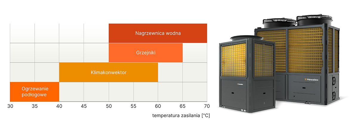 pompa ciepła monoblok PCCO jest w stanie utrzymywać temperaturę na wylocie z jednostki zewnętrznej na poziomie 58°C nawet do -15°C na zewnątrz i 50°C do -25°C, bez uwzględniania pracy dodatkowego źródła grzewczego