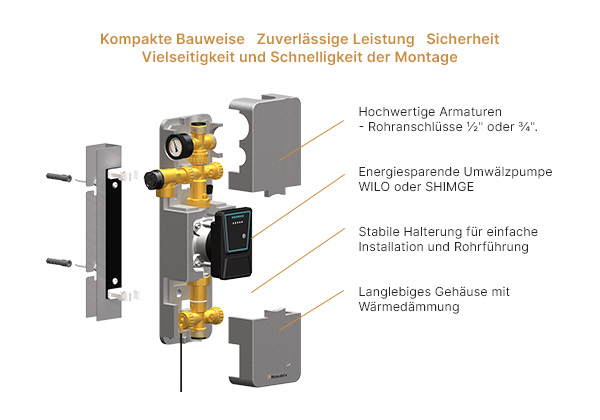 Kombination einer 1-Wege-Pumpeneinheit mit einem modernen Steuergerät mit PWM-Signal. Einfache Installation und schnelle Inbetriebnahme des Systems.