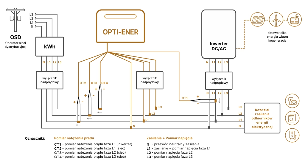 Zasada działania systemu OPTI-ENER została oparta o własny układ pomiarowy realizowany przez sterownik OPTI-ENER. Prawidłowy montaż i połączenie żył pomiarowych napięcia oraz przekładników prądowych dla pomiarów natężenia prądu jest kluczową kwestią działania systemu.