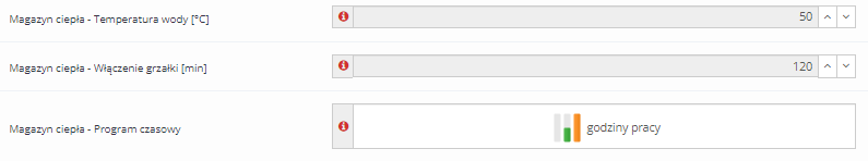 Wymaganą temperaturę wody dla funkcji MAGAZYN CIEPŁA ustala się w parametrze Magazyn ciepła – Temperatura wody. Wartość ta będzie utrzymywana w buforze w czasie wyznaczonych przedziałach programu czasowego.