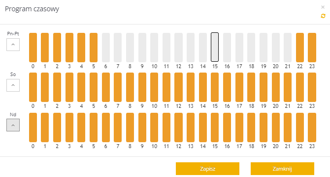 Na podstawie powyższego przykładu widzimy, że funkcja MAGAZYN CIEPŁA aktywna będzie od poniedziałku do piątku w godzinach od 22:00 do 6:00 oraz w weekendy przez całą dobę.